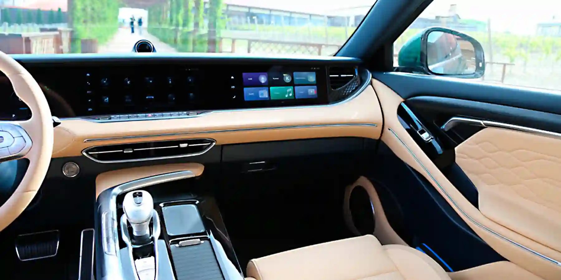 Первое, что бросается в глаза в салоне, — огромный продолговатый дисплей во всю ширину передней панели. Сказать, что выглядит эффектно, — не передать даже части его сущности, он шикарный. Но главное — его, точнее, переднюю панель, где в одной плоскости размещены три дисплея, можно просто задвинуть: одно касание кнопки на консоли, и экран превращается в узкую полосу. Практический смысл этого волшебства понять трудно, вот, например, надоел широкий — получи узкий и наоборот. Однако есть и оборотная сторона такого решения: проекции на лобовое стекло не предусмотрено, устройство негде смонтировать. Увидев дисплей с изменяемой геометрией, про эту проекцию вспомнят только самые дотошные, которым обязательно надо к чему-нибудь придраться. Производитель обещает 30 тыс. циклов подъемов-опусканий панели или 10 лет работы этого механизма, но, честно говоря, не думаю, что кому-то захочется проделывать эту манипуляцию по восемь раз на дню. Сверху центральной панели не часы, как можно было бы подумать, а камера, в Китае она реализует Face ID, можно обойтись без ключа, у нас это просто салонная камера, с помощью которой можно вывести на экран изображение салона и сделать селфи.