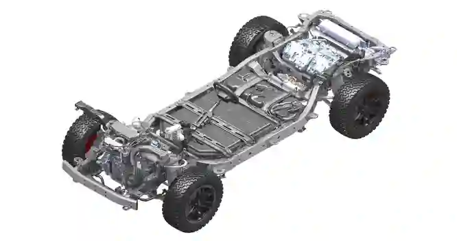 Емкость батареи у гибридной версии M-Hero составляет 56,88 кВт. Не так уж много: запас хода на электротяге приближается всего к 150 км, но в случае с гибридом это и не важно. Однако сделана батарея красиво: она литий-железо-фосфатная и двухслойная – между уровнями ячеек проложены два горизонта PI-пленки жидкостных контуров. Пленка нужна для подогрева, жидкостные контуры – и для подогрева, и для охлаждения. Заключена батарея в алюминиевый корпус с ячеистой структурой стенок, а снизу прикрыта многослойной защитой из алюминия и стали. Вдобавок расположена она внутри рамы, и от внешнего края порога до нее 480 мм. Получается, что и при боковом ударе батарее мало что угрожает.