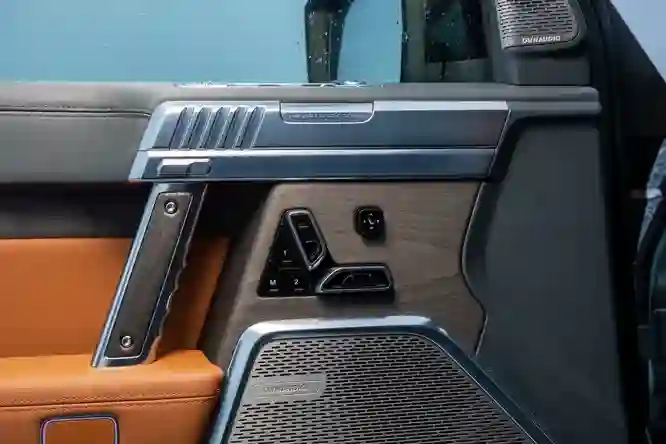 А вот от интерьера впечатления неожиданные. Посадка водителя на редкость удобна. Тумблеры на центральной консоли выполнены в авиационном стиле – один выполняет функции селектора трансмиссии, второй отвечает за настройки противобуксовочной системы, между ними – выбор уровня подвески. Графика щитка приборов – как в компьютерной игре. Дверные ручки стилизованы под пистолеты; на педаль газа нанесена пиктограмма play, на педаль тормоза – pause. Декоративные вставки из матового дерева, кожа сидений добротная, у кресел есть и подогрев, и вентиляция. Так что салон, бесспорно, хорош – с настроением. Жаль только, что для ног пассажиров второго ряда места маловато, но этот недостаток можно признать несущественным.