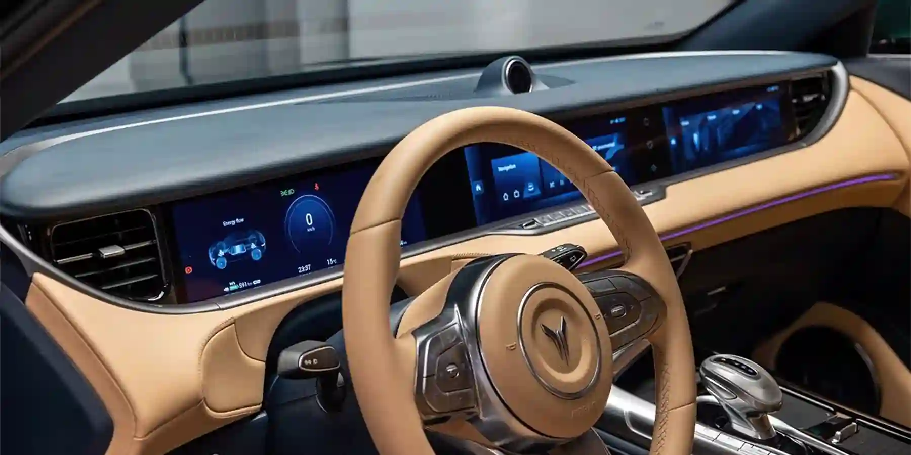 В передней части салона установлено три монитора — диагональю 12,3 дюйма каждый. Интерьер полностью обшит кожей, в том числе передняя панель и дверные карты. Всего доступно три варианта отделки: бежевый с тёмно-синим (как на фотографиях), чёрный с тёмно-синим и коричнево-красный с акцентами цвета слоновой кости.