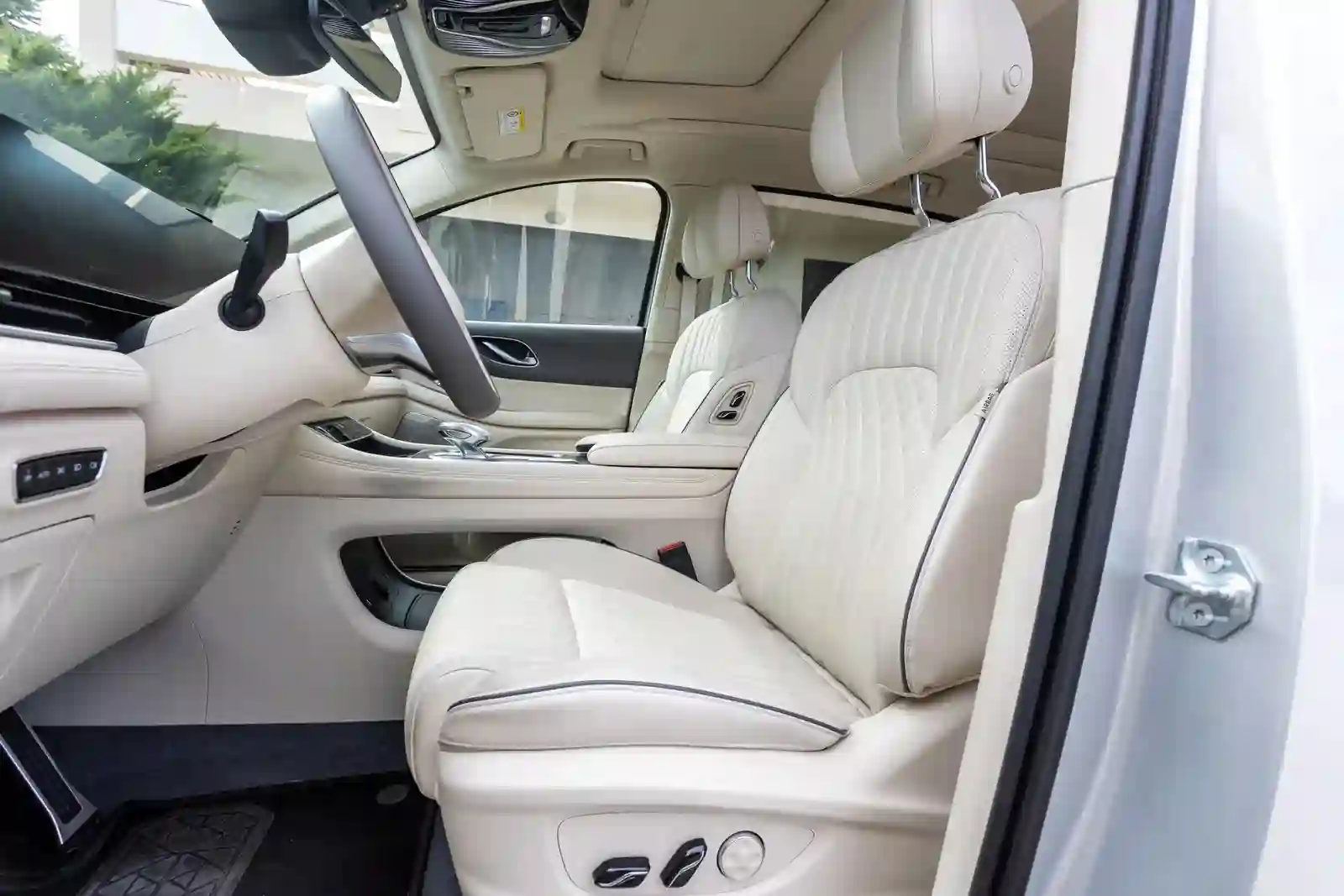 Во втором ряду установлены раздельные капитанские кресла с множеством регулировок и функциями подогрева, вентиляции и массажа. Пассажиры в них могут разместиться практически лежа. К слову, доплачивать за эту красоту не придется, ведь такие сиденья входят в список стандартного оснащения. Еще тут предусмотрены USB-зарядки, возможность регулировать температуру, подставка под телефон и откидной столик, за которым можно поработать на ноутбуке или перекусить.